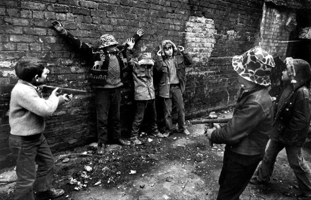 Дети играют "в войну" в районе проживания рабочего класса, Лондондерри, 1997 год.